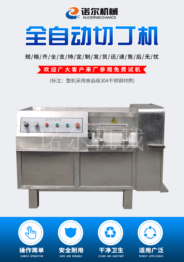 产品简介:全自动切丁机参照国际先进机械进行设计制造,结构合理,该机能做到精确“丁”,“丝”,“片”且工作效率高,切割肉丁最小规格为4mm,最大规格为30mm,是食品加工切割方面的首选设备。